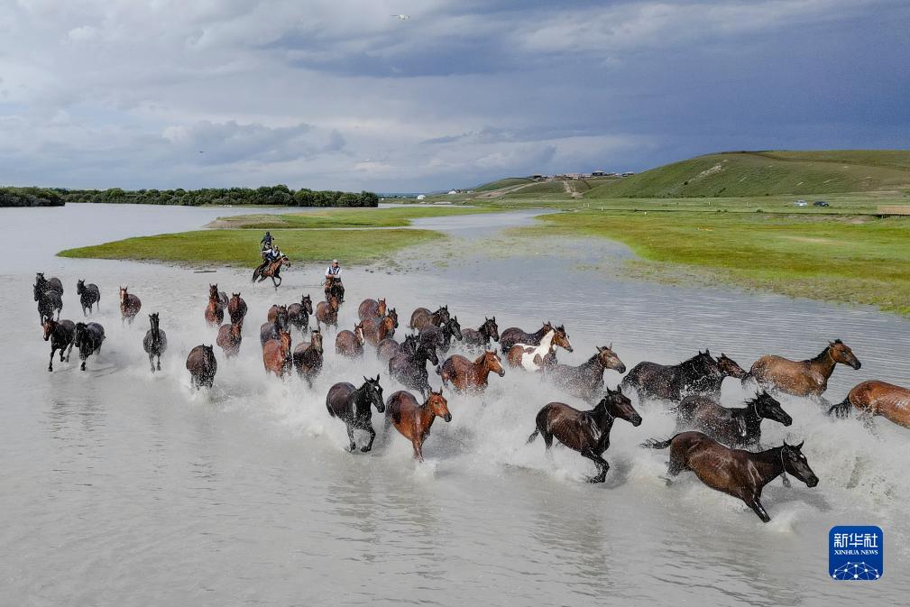 新疆伊犁哈薩克自治州昭蘇縣濕地公園景區的“天馬浴河”景觀(7月17日攝,無人機照片)。