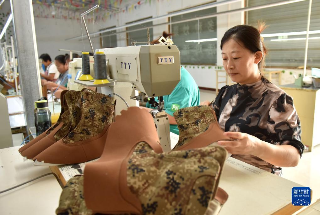8月29日,工人在河北省威縣香花營村一家製鞋廠生産車間工作。