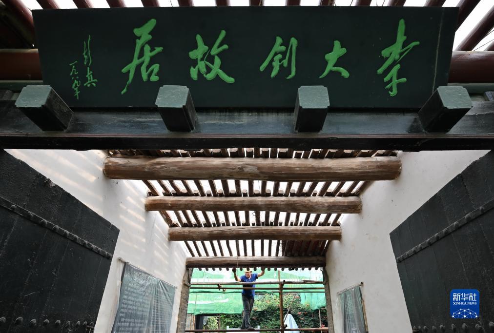 8月29日,工人在李大釗故居維修保護工程工地施工。