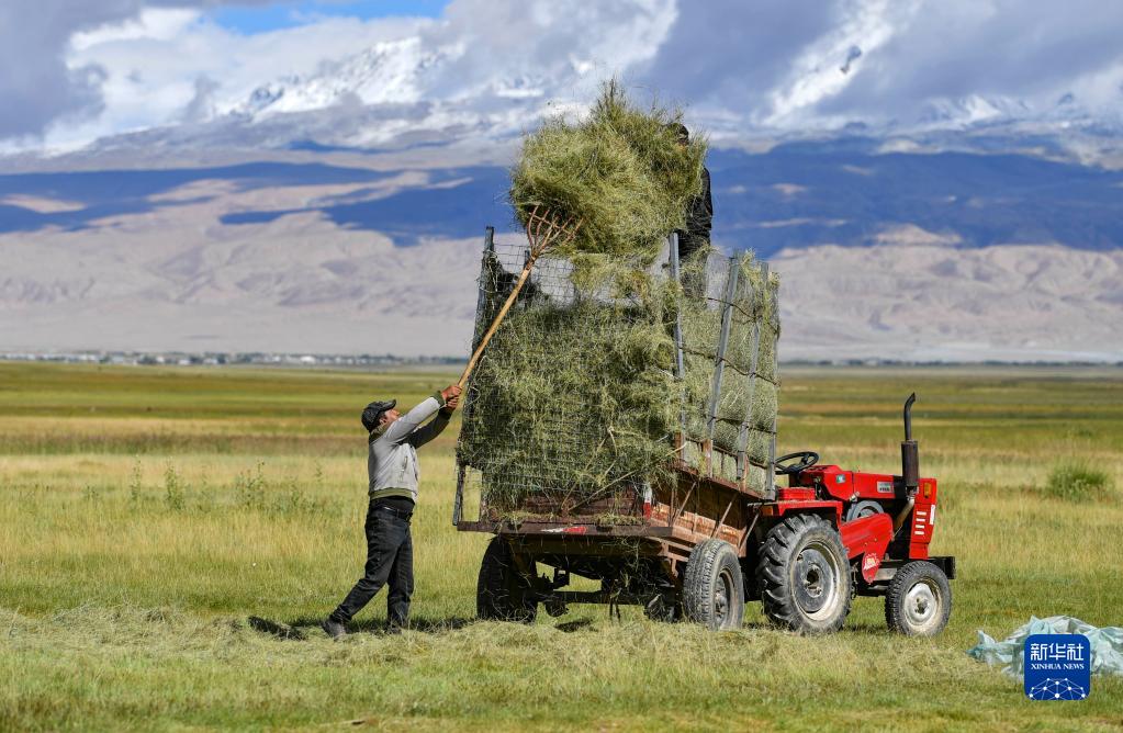 在新疆塔什庫爾幹塔吉克自治縣塔合曼鄉,牧民普拉提將收割的牧草裝車(8月27日攝)。