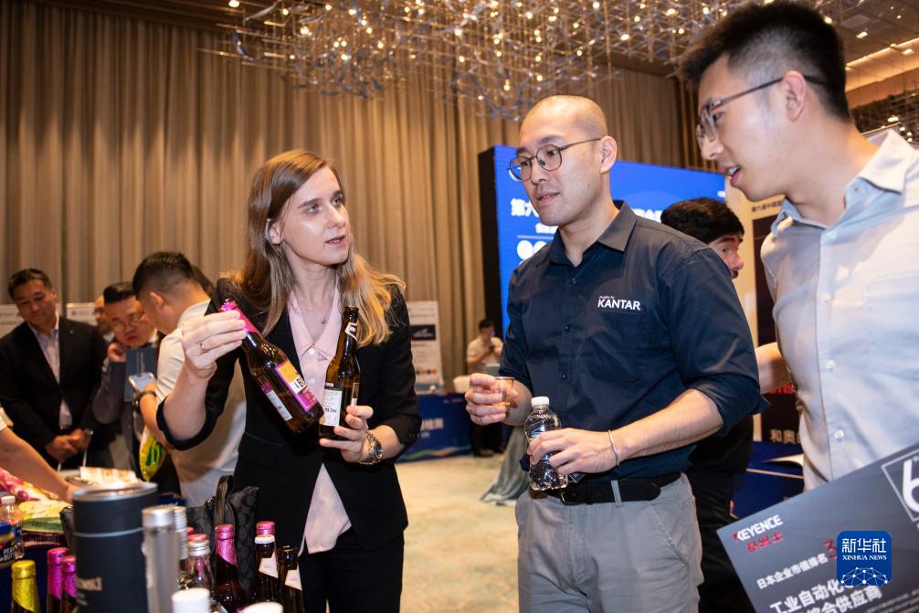8月29日,在深圳舉行的進博會展前供需對接活動上,波蘭投資貿易局的工作人員(左前)向採購商展示風味啤酒。