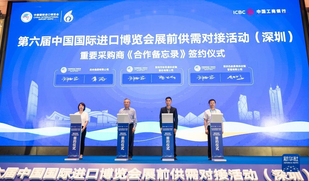 8月29日在第六屆中國國際進口博覽會展前供需對接活動(深圳)上拍攝的重要採購商《合作備忘錄》簽約儀式。
