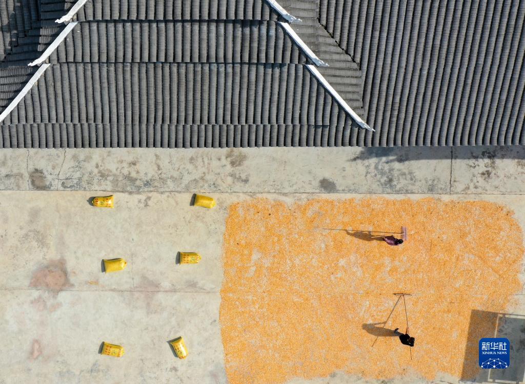 8月29日,貴州省銅仁市玉屏侗族自治縣亞魚鄉郭家灣村農民在翻曬收穫的玉米(無人機照片)。