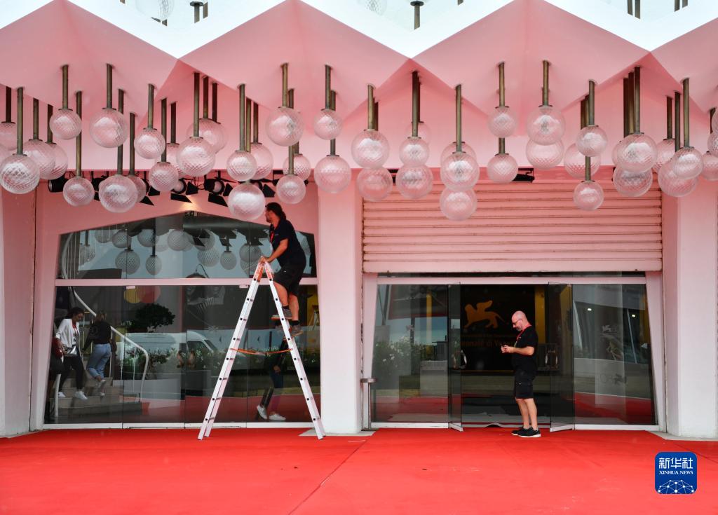 8月29日,在意大利威尼斯利多島,工作人員在電影節開幕式紅毯區域做準備。