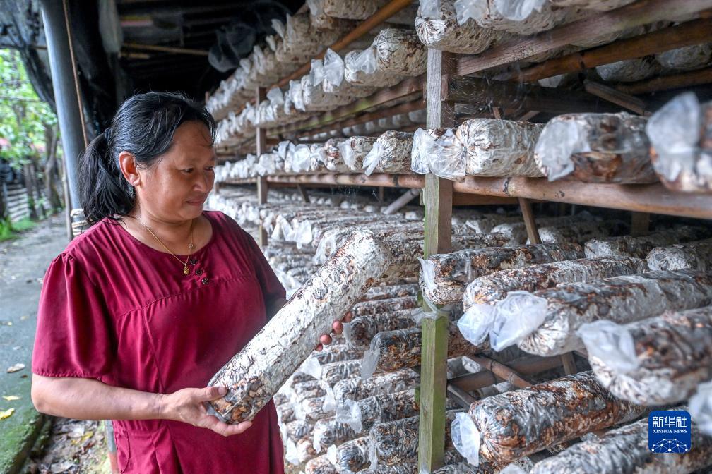 8月29日,種植戶陳金英在浙江省麗水市慶元縣濛洲街道冬瓜源食用菌基地查看菌棒上香菇的長勢情況。陳金英家種植了三萬根菌棒,年收入十多萬元。