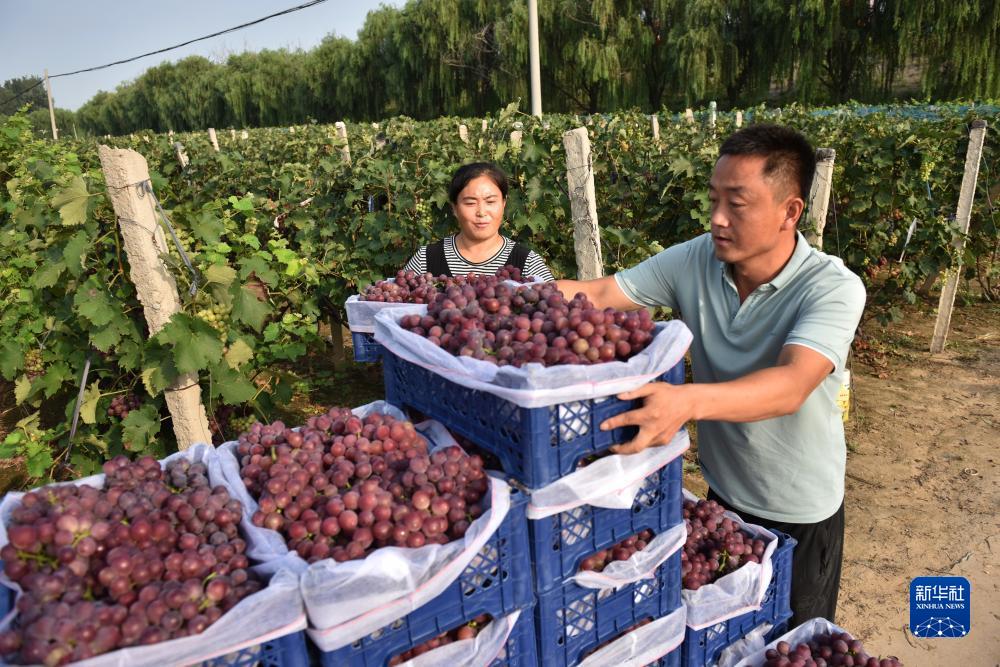8月30日,邢&市威縣戚霍寨村一家庭農場果農整理裝筐的葡萄。