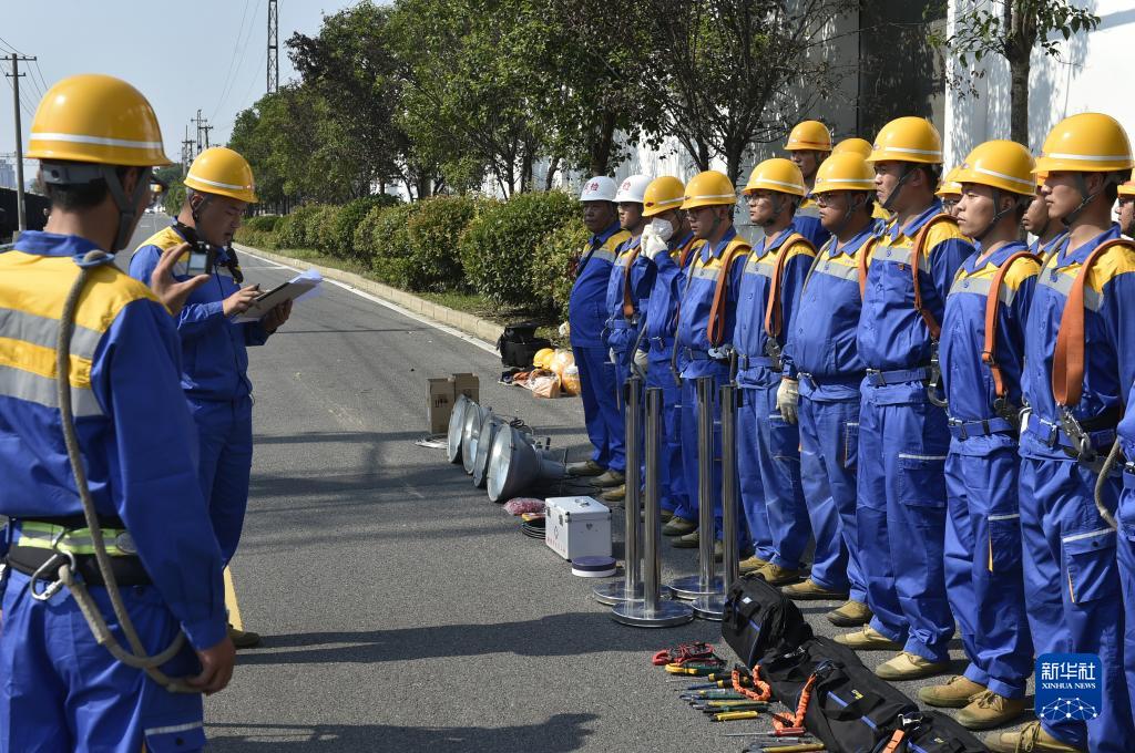 8月29日,在鄭州北站編組場,中國鐵路鄭州局集團有限公司鄭州供電段工作人員在檢修投光燈前進行準備工作。