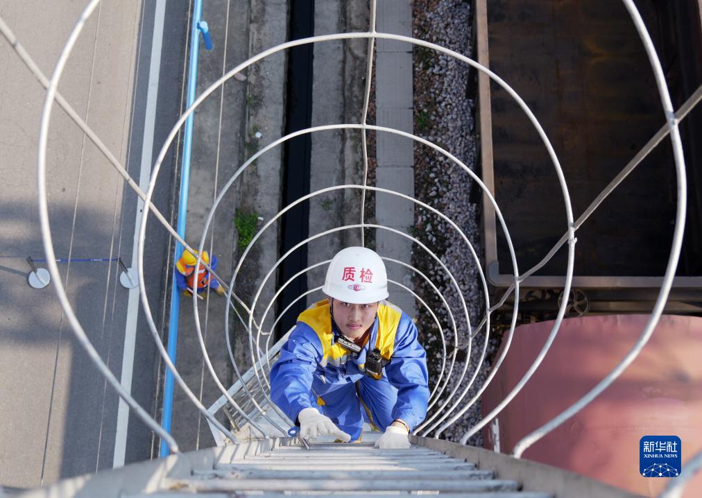 8月29日,中國鐵路鄭州局集團有限公司鄭州供電段工作人員在鄭州北站編組場內攀爬燈橋。