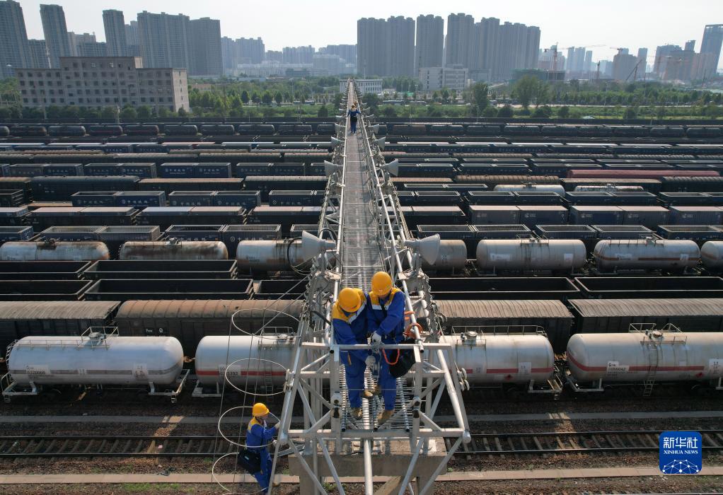 8月29日,中國鐵路鄭州局集團有限公司鄭州供電段工作人員在鄭州北站編組場的燈橋上檢修投光燈(無人機照片)。
