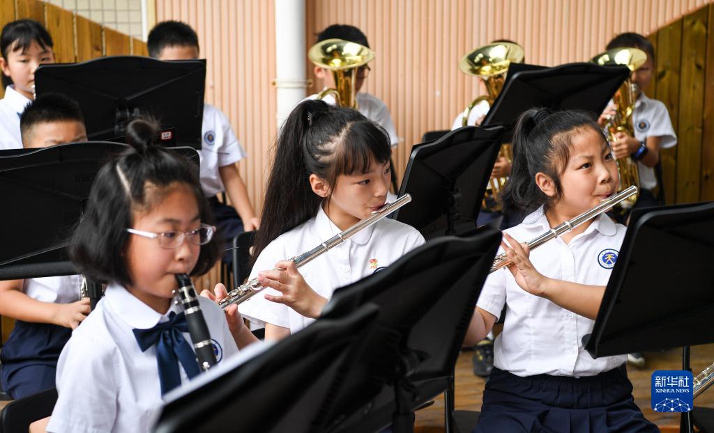 8月30日,重慶市南岸區天&崗雅居樂小學管樂團成員為前來報到的學生和家長演奏樂曲。