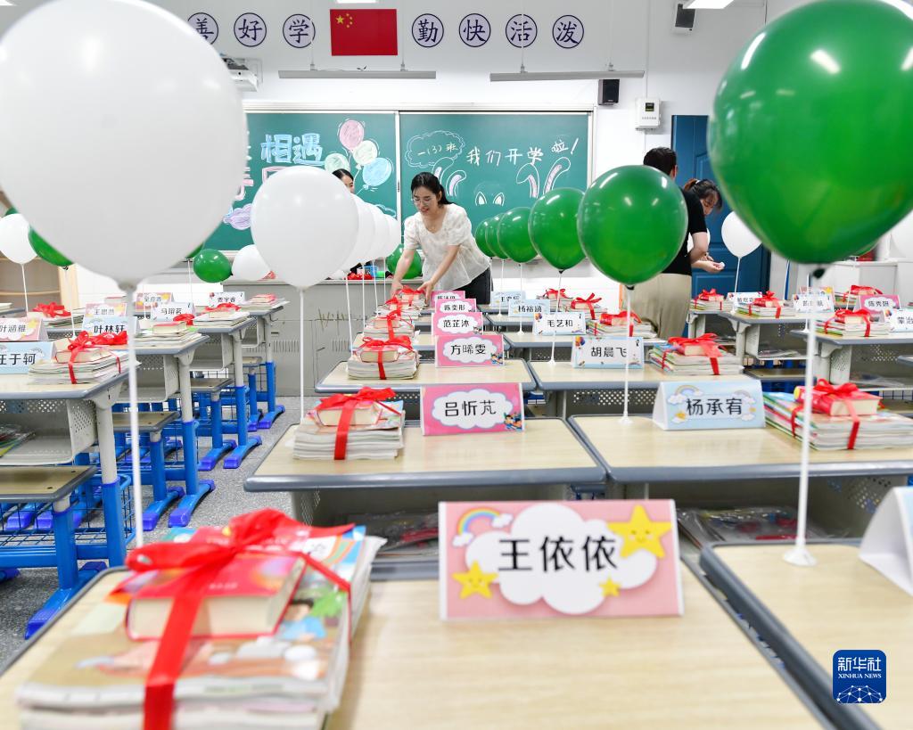 8月30日,教師在浙江省建德市明鏡小學一年級的教室裏佈置,為開學營造溫馨的環境。