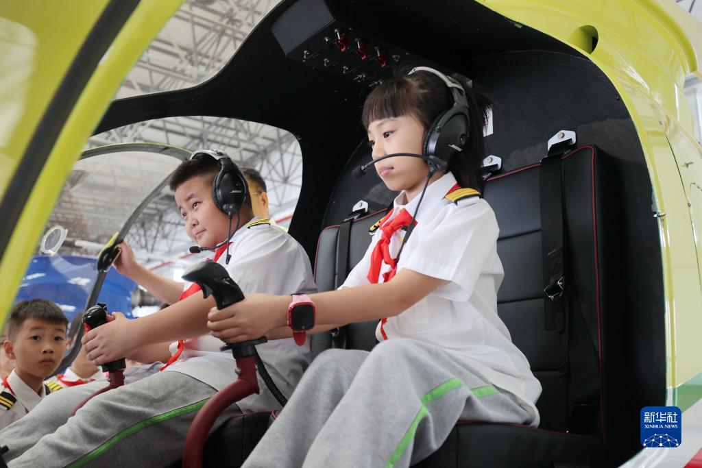 8月30日,在德清縣通航智造小鎮莫幹山機場,雷甸鎮中心小學學生在駕駛艙內體驗模擬飛行。