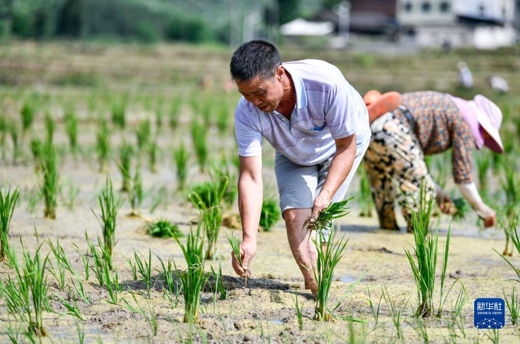 陳良東(前)與村民在水稻制種基地裏插秧(5月29日攝)。