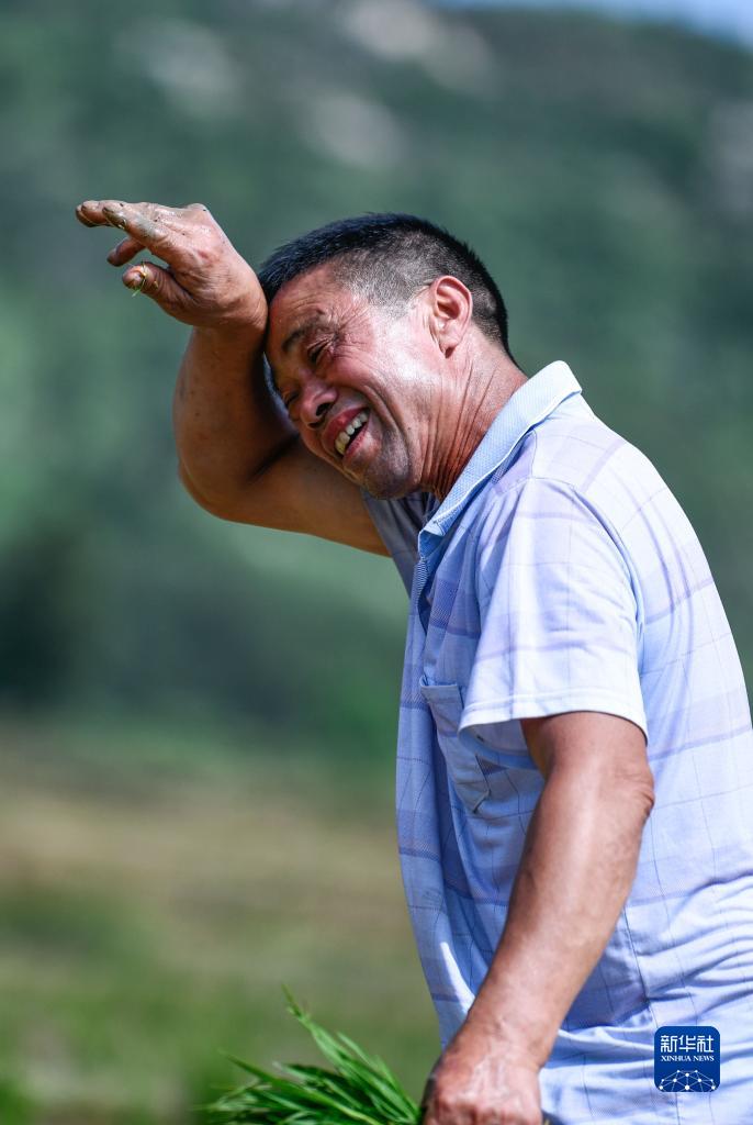 陳良東在水稻制種基地裏插秧時擦汗水(5月29日攝)。