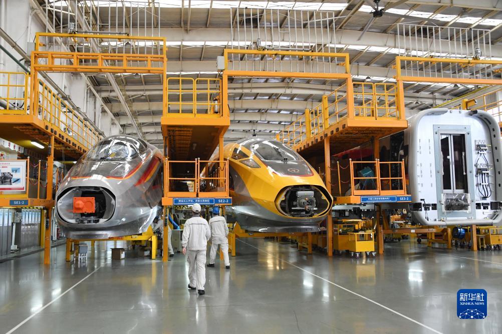 8月29日,中車青島四方總裝車間工作人員在復興號智能動車組生産線上進行裝配作業。