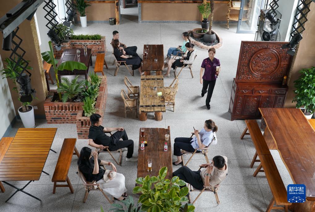游客在秦嶺北麓腳下的西安市周至縣馬召鎮辛口村一家驛站內休閒(7月14日攝)。