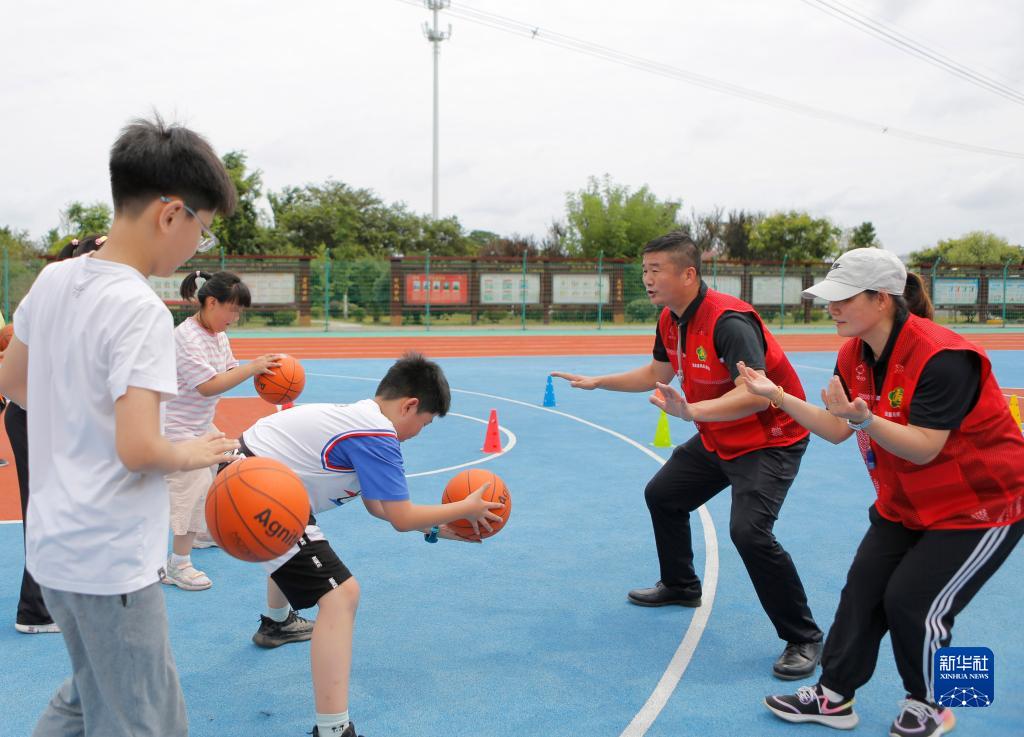 8月30日,在江蘇揚州寶應縣小天使幼兒園,志願教練指導小朋友學習籃球。