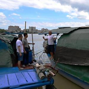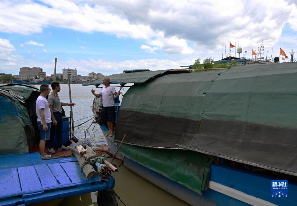 8月30日,在福建漳州市龍海區石碼鎮漁業社區漁船專用碼頭,當地漁業社區工作人員在勸説船上漁民(右)上岸避風。