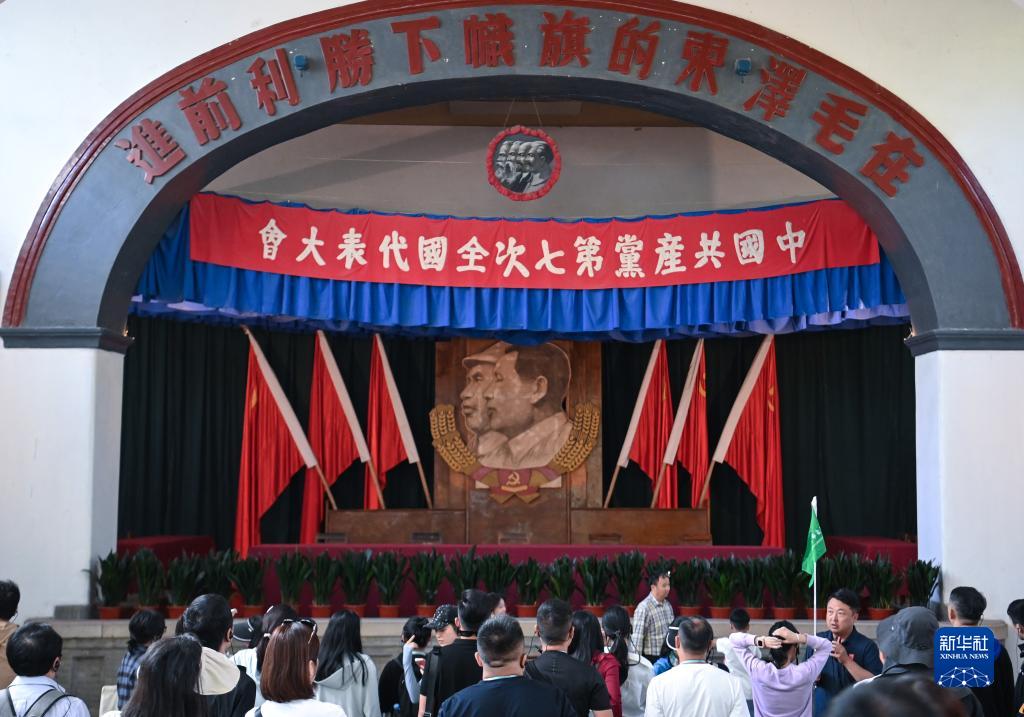 8月29日,在陜西延安,游客參觀楊家嶺革命舊址的中央大禮堂。