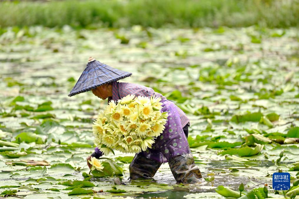 8月30日,在廣西柳州市柳江區百朋鎮懷洪村,農民在采收蓮花。