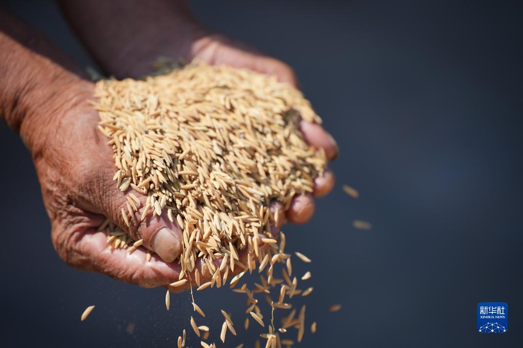 8月30日,貴州省黔東南苗族侗族自治州岑鞏縣思旸鎮新安村村民在查看收穫的稻穀。