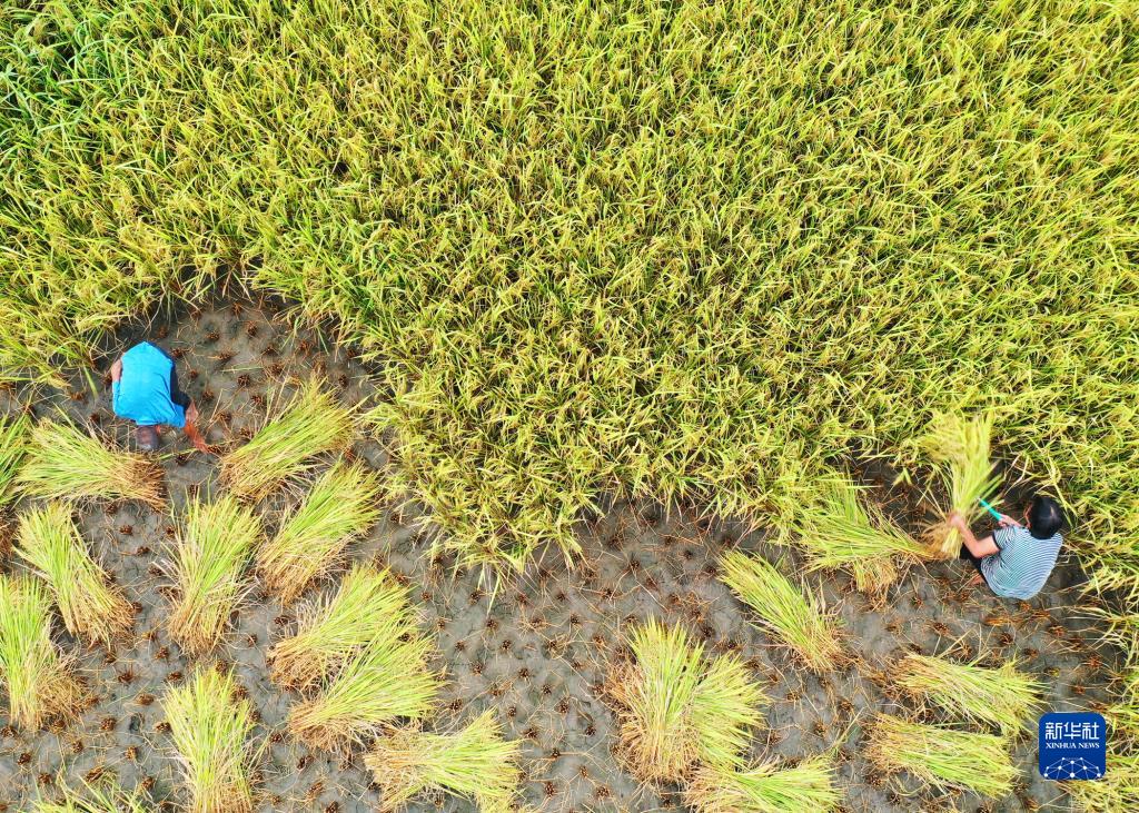 8月30日,農民在湖南省郴州市嘉禾縣珠泉鎮車頭村收割水稻(無人機照片)。