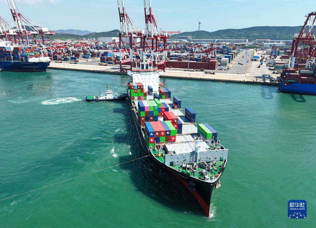 8月30日,“中外運海口”輪緩緩駛離山東港口青島港(無人機照片)。