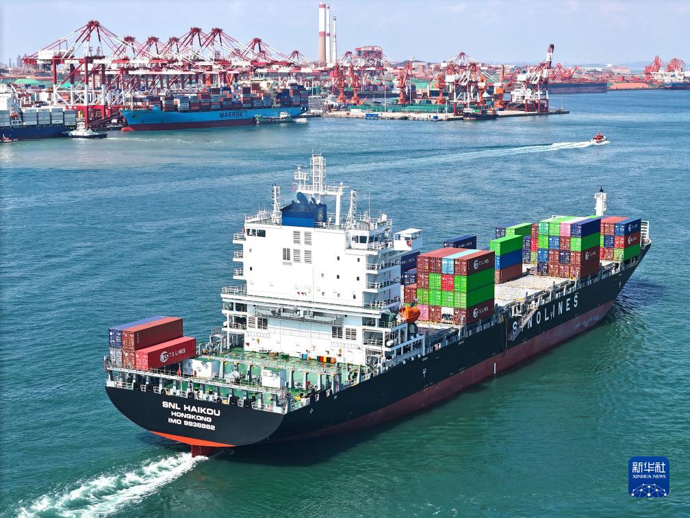 8月30日,“中外運海口”輪緩緩駛離山東港口青島港(無人機照片)。