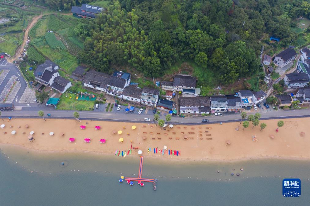 8月30日拍攝的長汀村的長汀沙灘景區(無人機照片)。雲和縣石塘鎮長汀村位於浙江省第三大人工湖——雲和湖畔、“十里雲河”美麗鄉村風景線的中心路段。