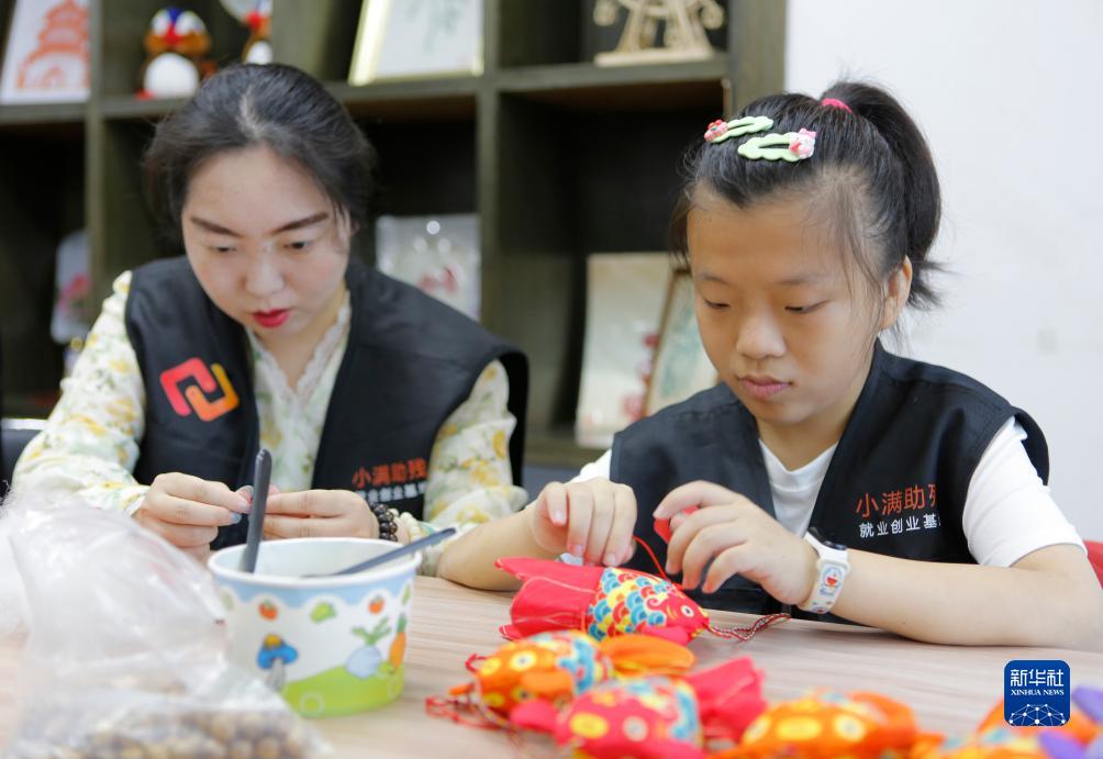 8月30日,在江蘇揚州小滿助殘就業創業基地,殘疾人士學習製作手工藝品。