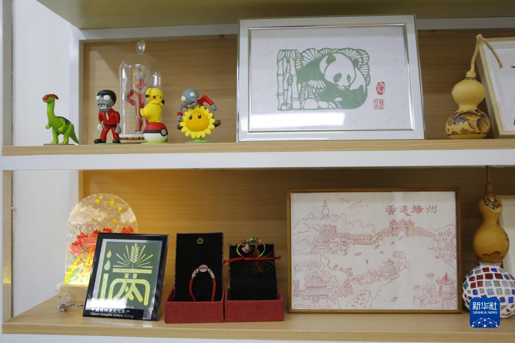 這是8月30日在江蘇揚州小滿助殘就業創業基地拍攝的手工藝品展示櫃。
