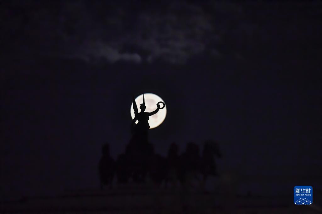 這是8月31日在俄羅斯首都莫斯科凱旋門旁拍攝的“超級月亮”。
