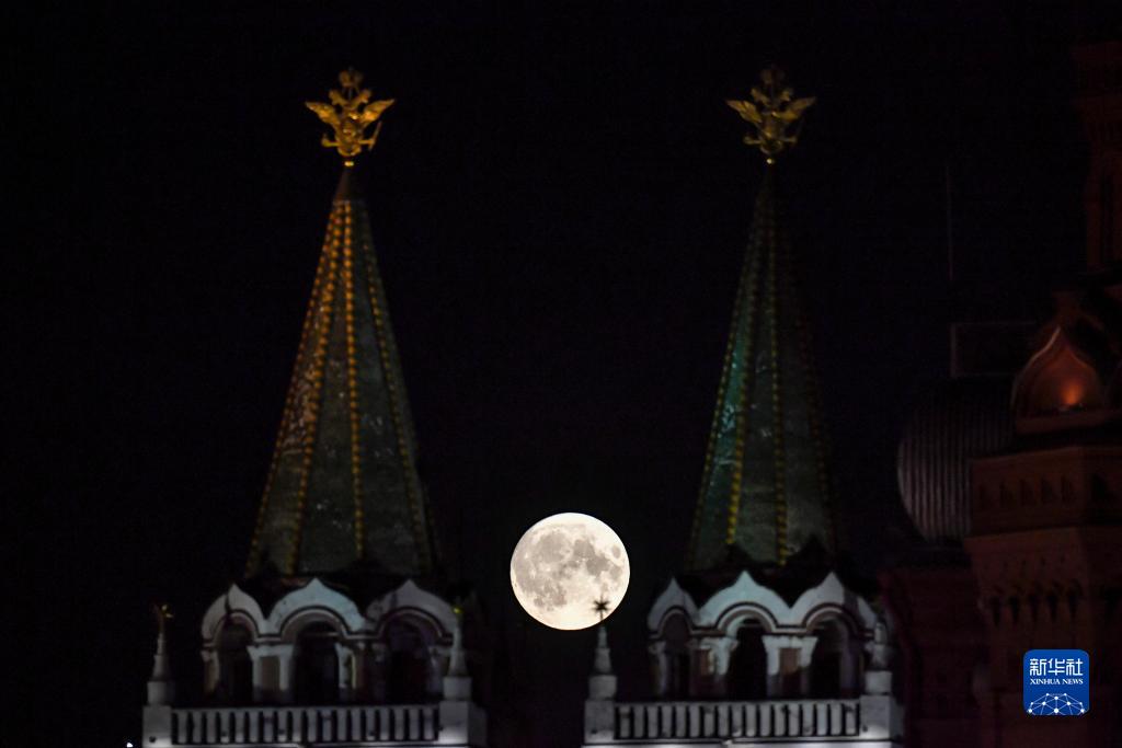 這是8月30日在俄羅斯首都莫斯科紅場附近拍攝的“超級月亮”。