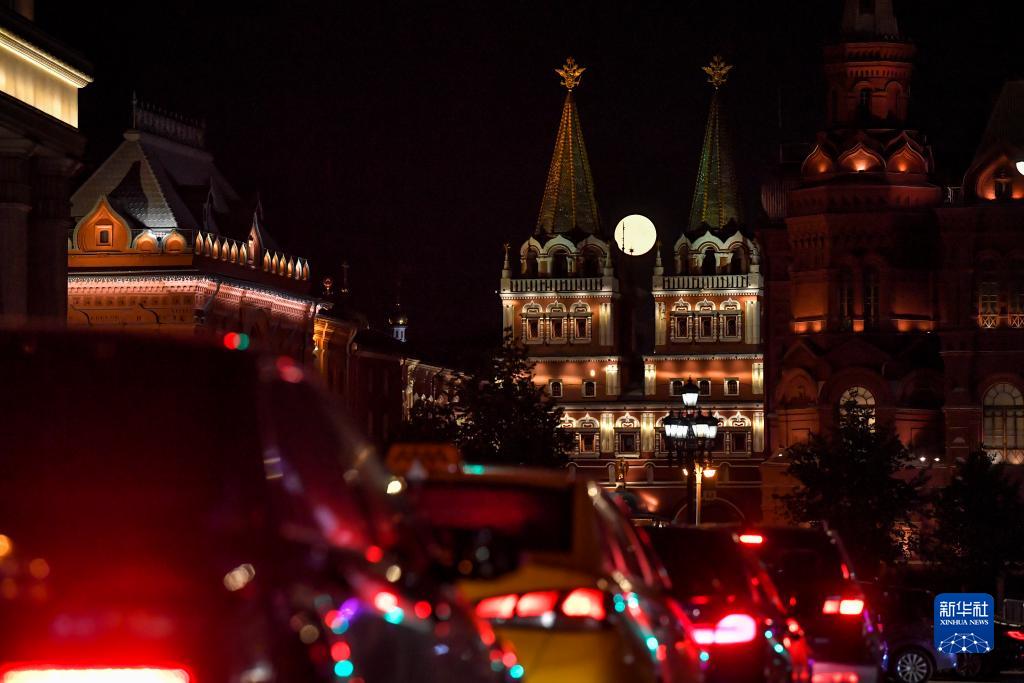 這是8月30日在俄羅斯首都莫斯科紅場附近拍攝的“超級月亮”。