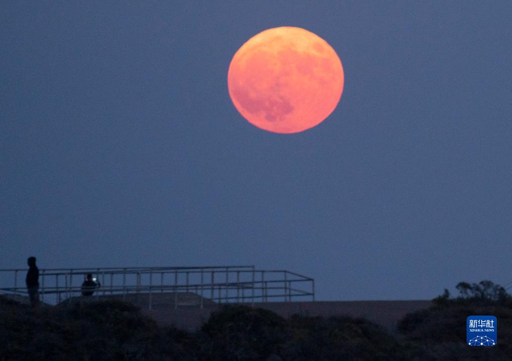 這是8月30日在美國舊金山金門大橋附近拍攝的“超級月亮”。