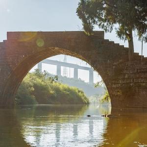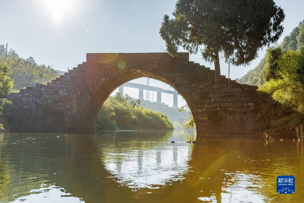 8月31日,一列動車組在晨曦中經過貴南高鐵銀坡河特大橋,前為建於清代光緒年間的蒙家橋。