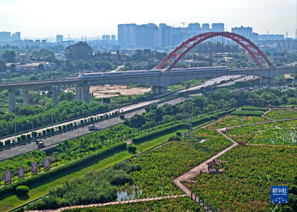 一列貴南高鐵列車駛過廣西南寧市那考河濕地公園(8月31日攝,無人機照片)。