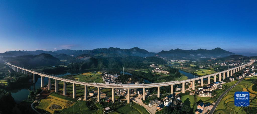 這是8月31日拍攝的位於貴州省都勻市境內的貴南高鐵營盤清水河雙線特大橋(無人機全景照片)。