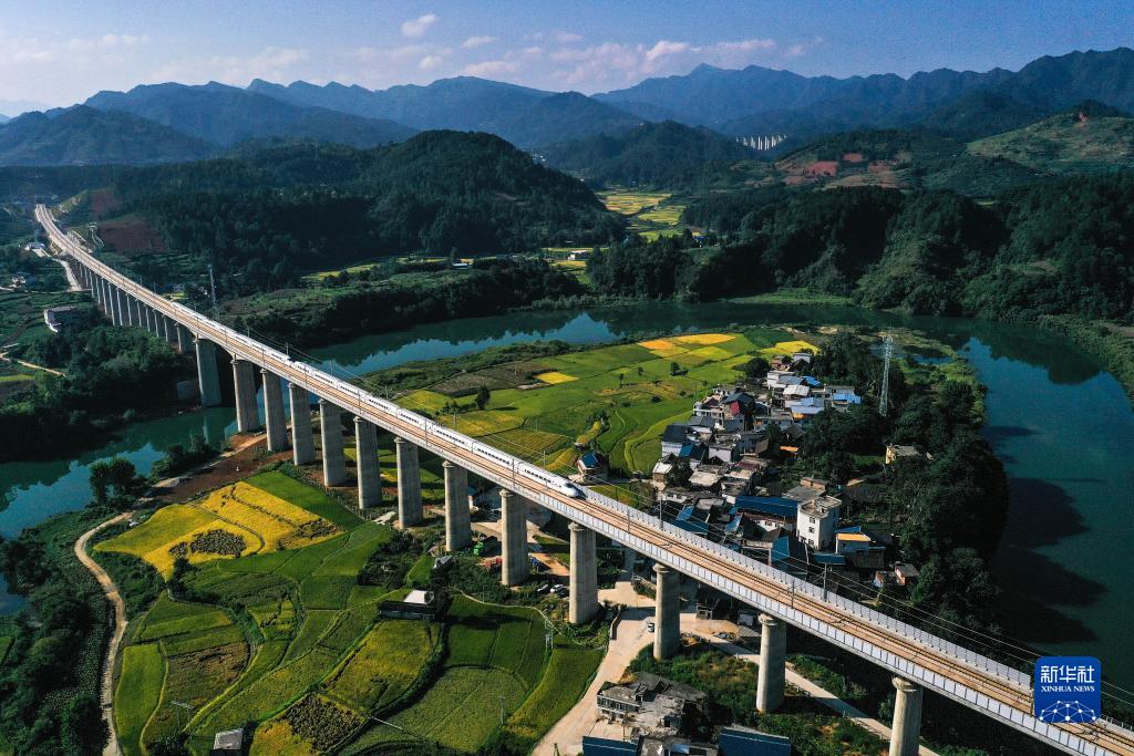 8月31日,一列動車組列車經過位於貴州省都勻市境內的貴南高鐵營盤清水河雙線特大橋(無人機照片)。