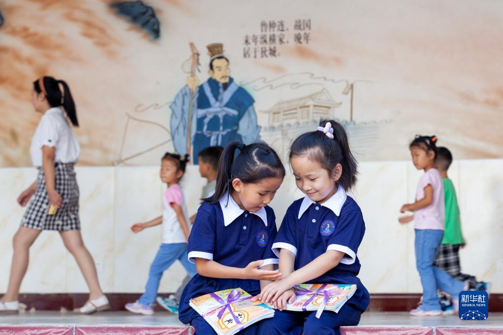 8月31日,山東省淄博市高青縣中心路小學,兩位一年級新生領到新書和新校服後在一起交流。