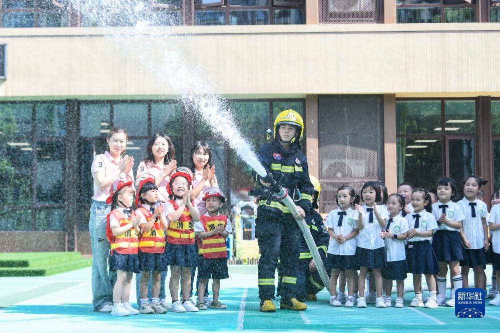8月31日,在四川省眉山市彭山區學院路幼兒園,眉山市彭山區消防救援大隊的消防員帶小朋友體驗消防水槍。