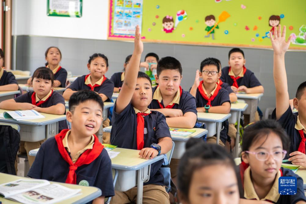 8月31日,湖南省常德市市場監督管理局在常德市武陵區第三小學開展關於食品安全的“開學第一課”。這是學生舉手發言。