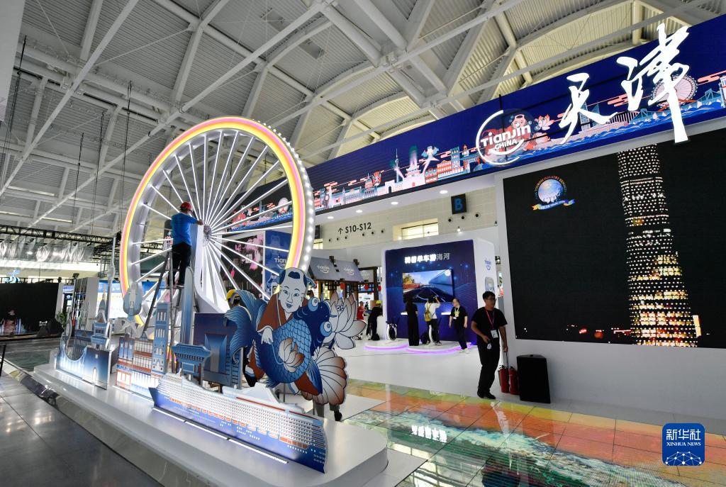 8月31日,在國家會展中心(天津),工作人員佈置天津展區。