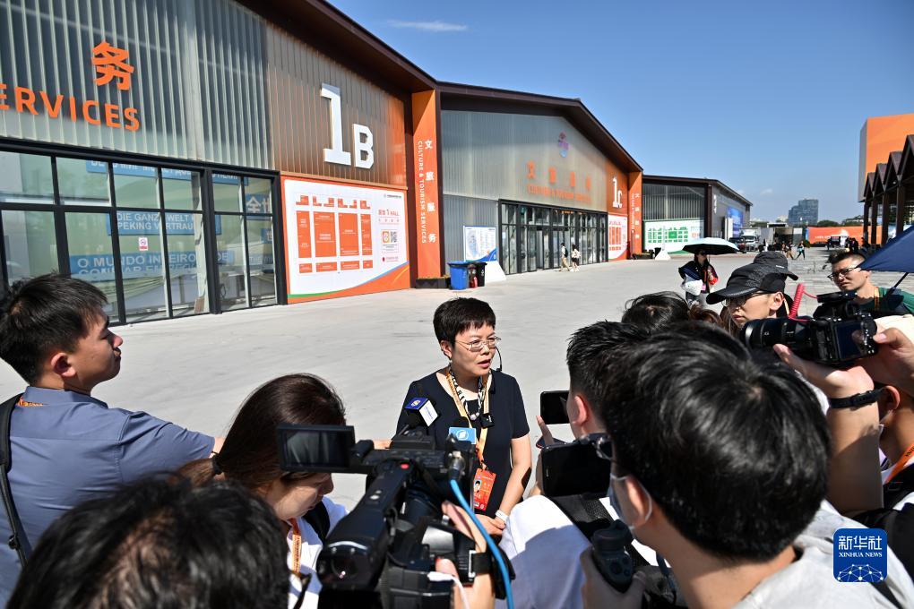 8月31日,工作人員向媒體介紹服貿會首鋼園區情況。