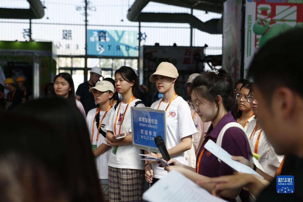 8月31日,在服貿會首鋼園區體育服務專題展區內,來自北京體育大學的服貿會志願者在參加培訓。