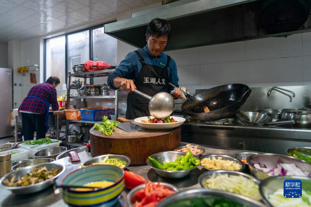 麗江市玉龍納西族自治縣白沙鎮玉湖村村民和武全在自家開的農家樂廚房裏炒菜(8月28日攝)。