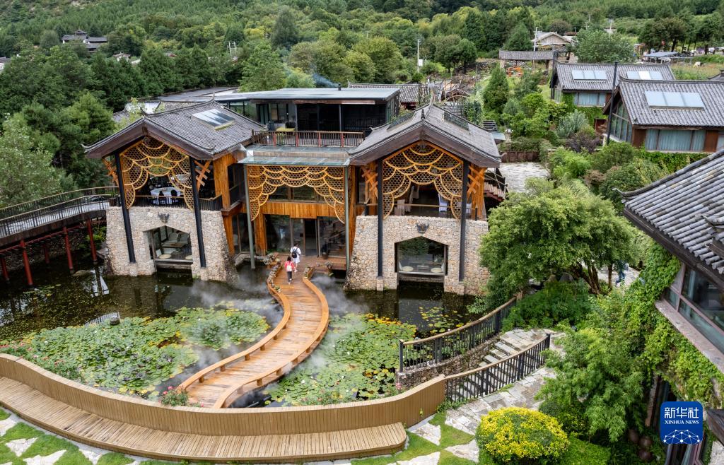 游人走進玉湖村中的一家酒店(8月28日攝,無人機照片)。