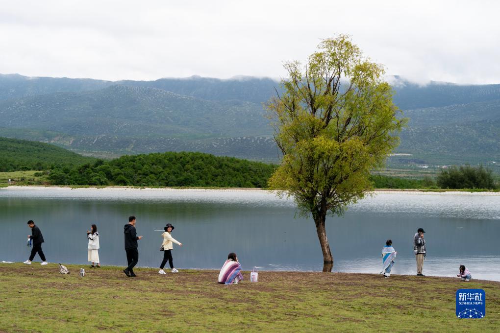 游客在麗江市玉龍納西族自治縣白沙鎮玉湖村龍女湖邊休閒游玩(8月28日攝)。