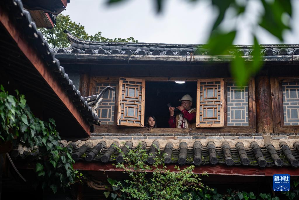 麗江市玉龍納西族自治縣白沙鎮玉湖村村民和傑林(右)在自家的納西文化體驗館為游客展示吹牛角號(8月28日攝)。
