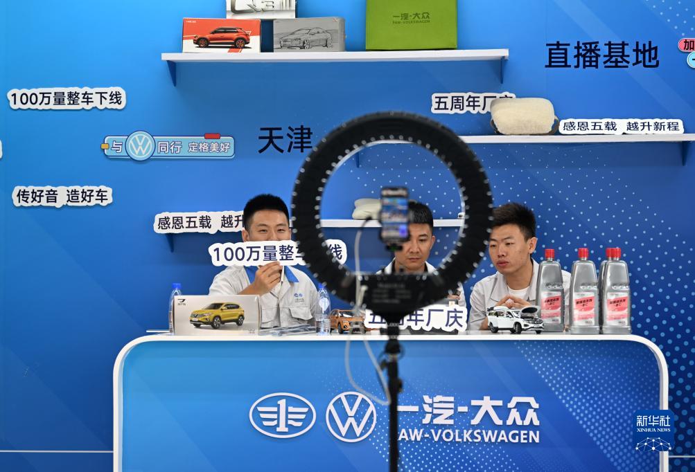 8月31日,在天津經濟技術開發區一汽-大眾華北基地,工作人員在儀式現場直播。
